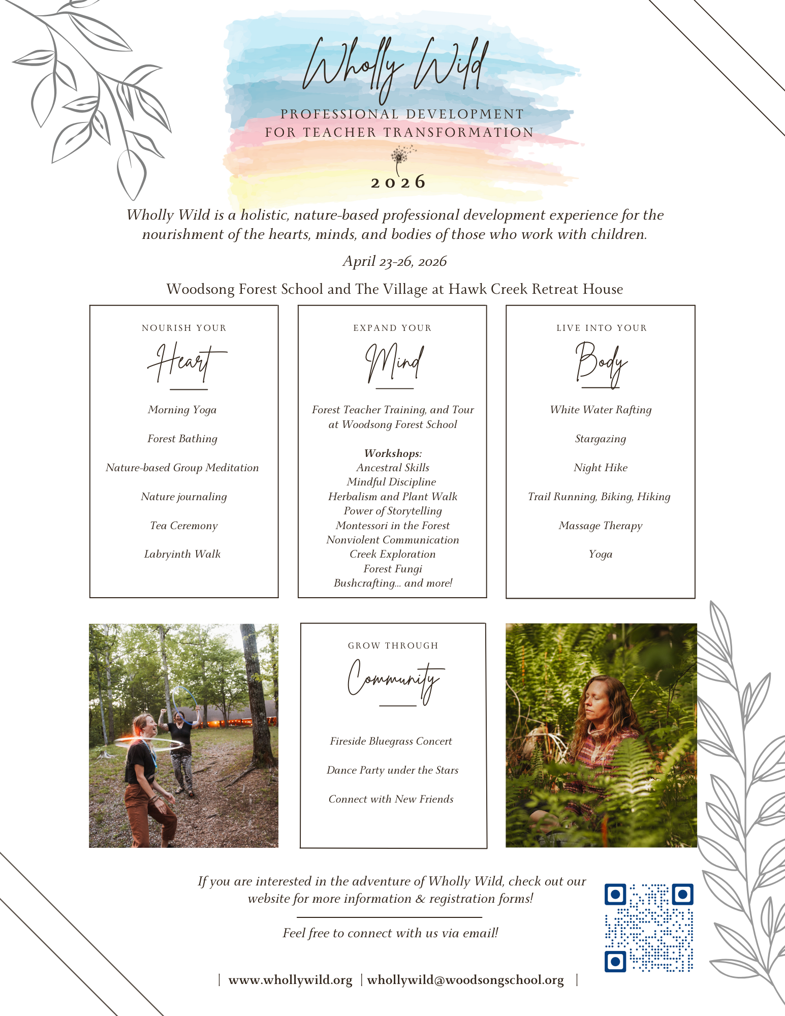 Join us at Woodsong Forest School and The Village at Hawk Creek Retreat House for Wholly Wild, a retreat for teacher transformation, on April 23-26, 2026.